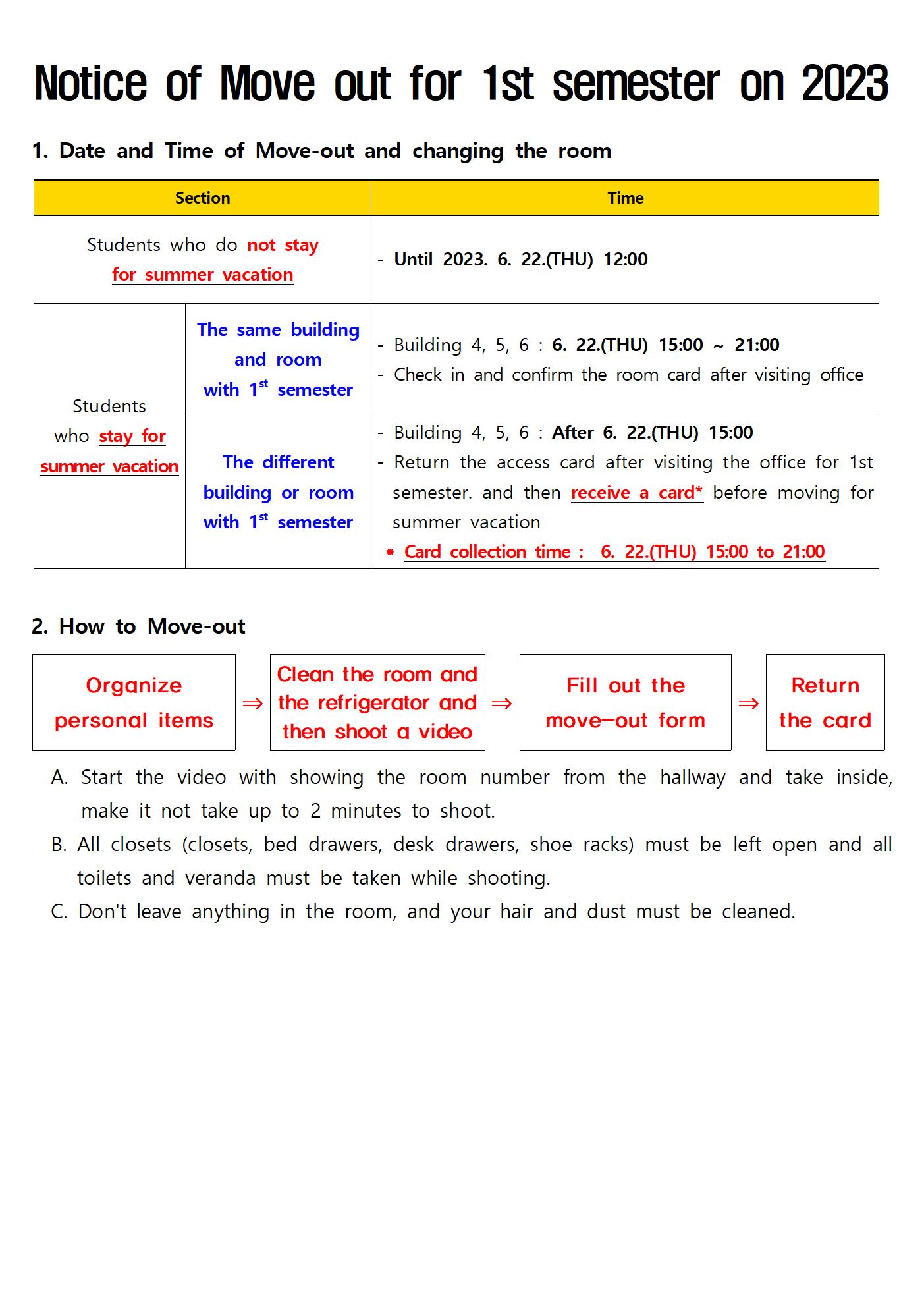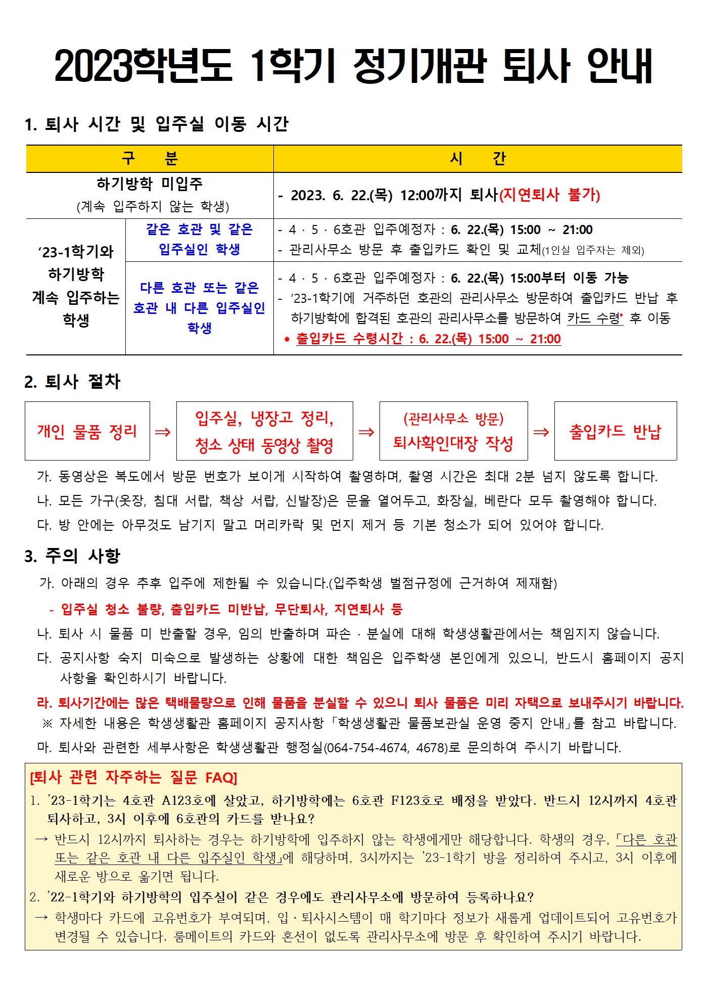 [ 부속기관 - 학생생활관 ] 2023학년도 1학기 정기개관 퇴사 안내/Notice of move out for 1st semester on 2023